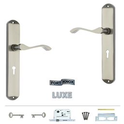The LUXE Satin & Black Nickel 3-lever lockset is designed for exterior doors, offering enhanced security.
